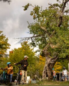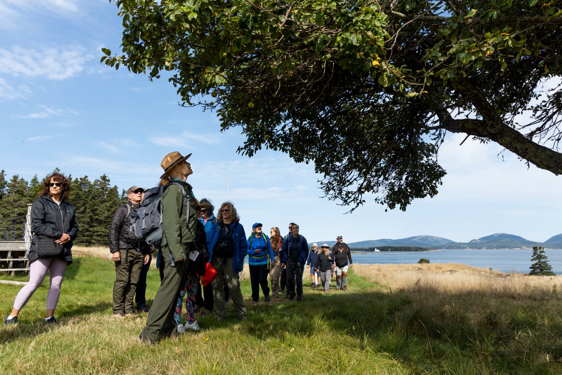 Meribeth Kambitsch, Acadia National Park interpretive ranger and language interpreter, stops with visitors under an heirloom apple tree on Baker Island. (Photo by Lily LaRegina/Friends of Acadia)
