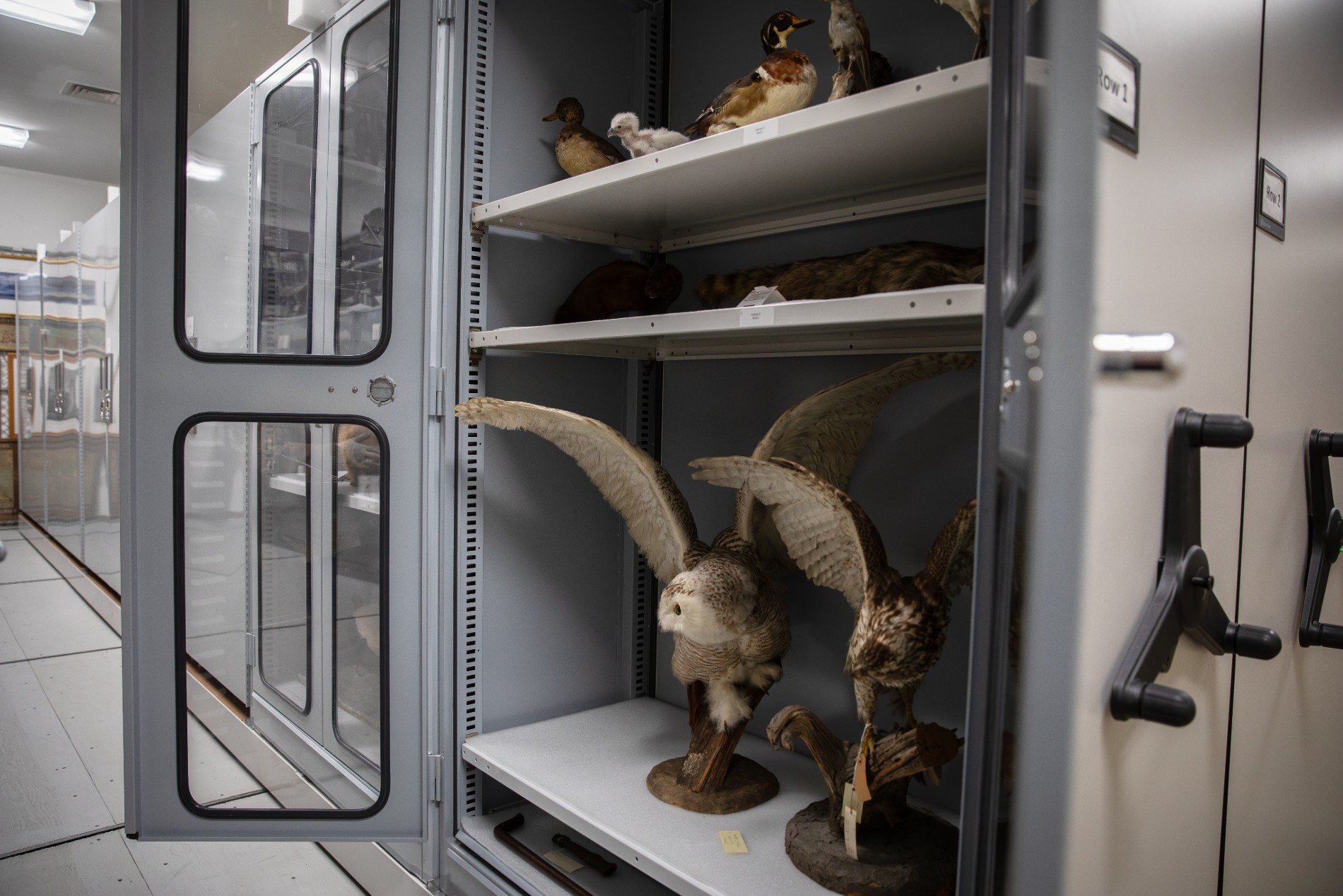 Taxidermized owls in a climate-controlled cabinet. (Julia Walker Thomas/Friends of Acadia)