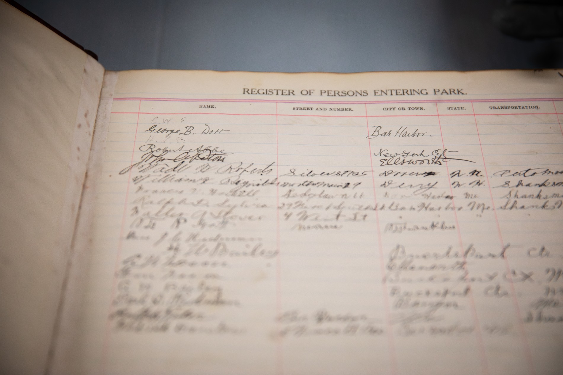 Register of visitors entering Lafayette National Park (which later became Acadia National Park)) from 1919. While one might assume that the first “visitor” would be George B. Dorr, it was one of the park ‘s other founders, Charles W. Eliot.