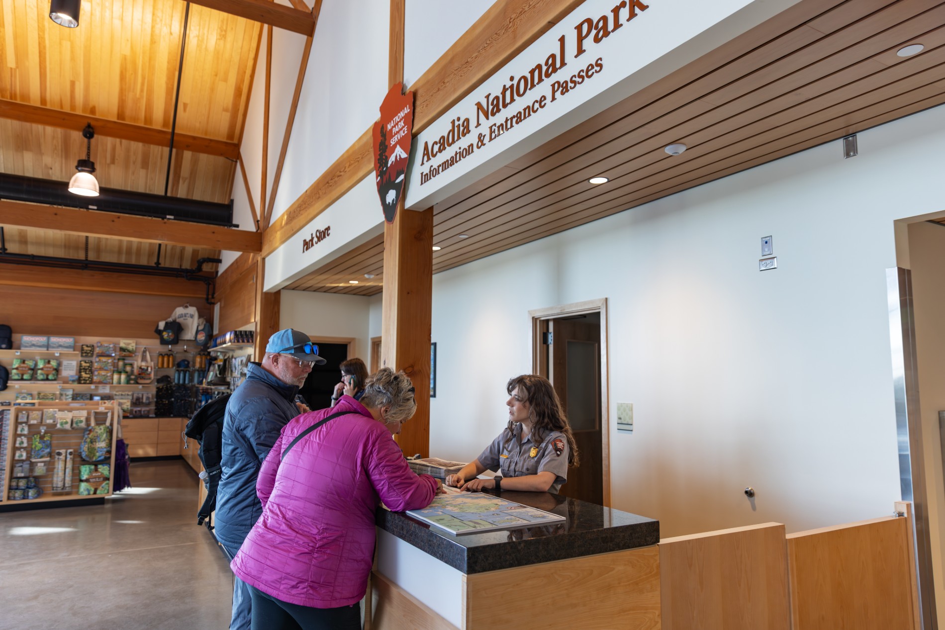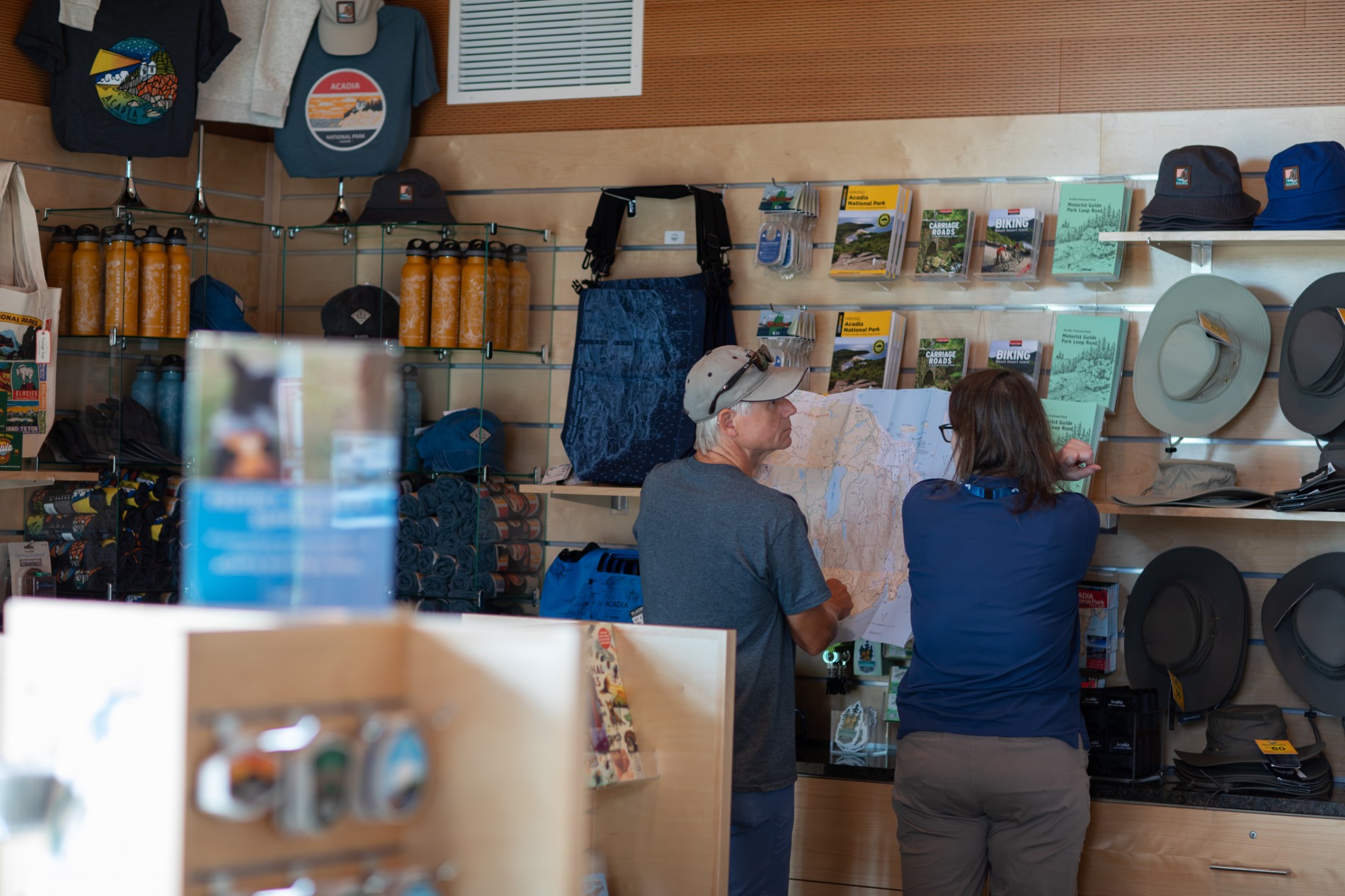 An Eastern National employee shows a park visitor an Acadia National Park map at the Acadia Gateway Center on its first official day open to the public on Wednesday, September 3, 2025. (Julia Walker Thomas/Friends of Acadia)