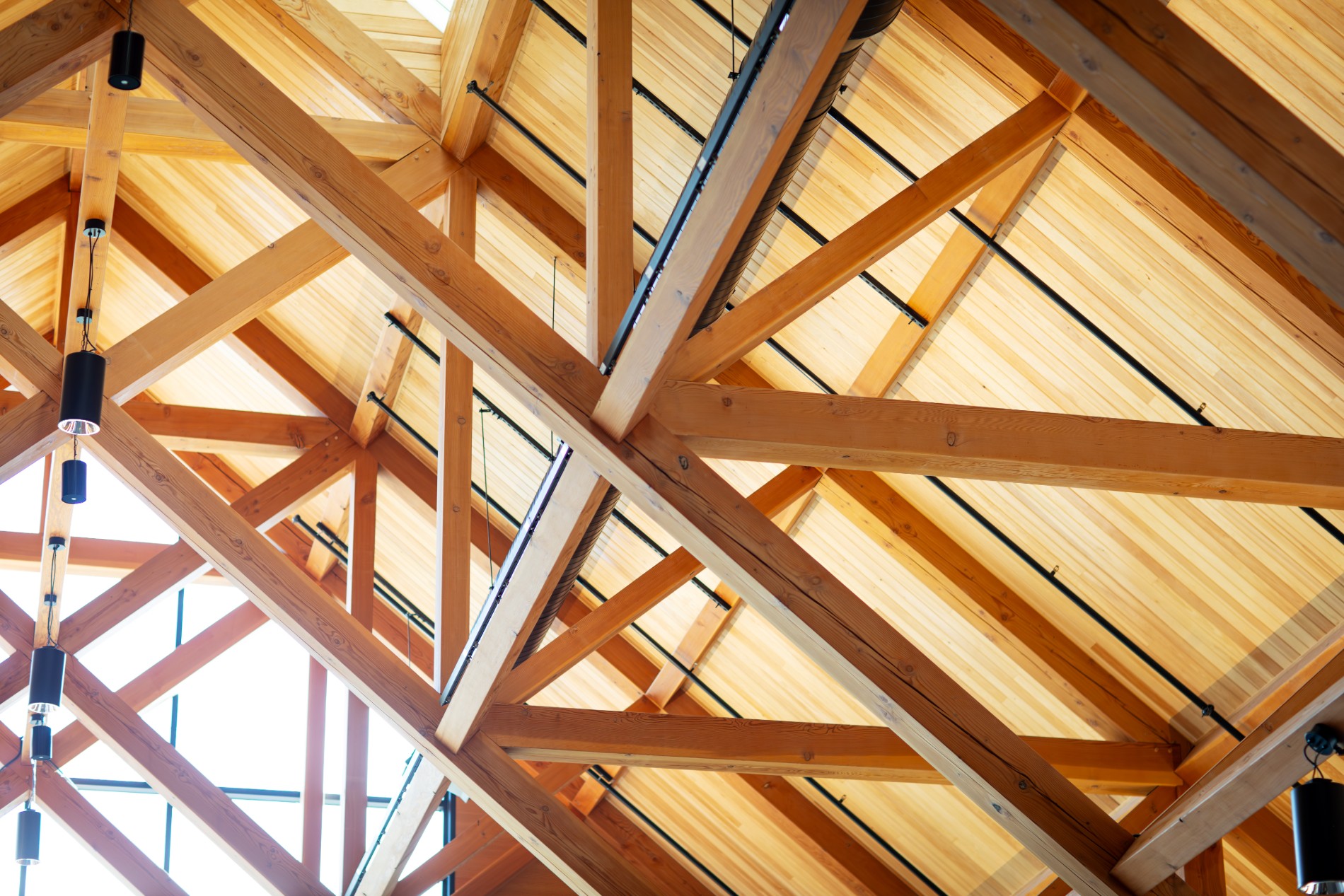 Timberframe ceiling beam detail at the Acadia Gateway Center on its first official day open to the public on Wednesday, September 3, 2025. (Julia Walker Thomas/Friends of Acadia)