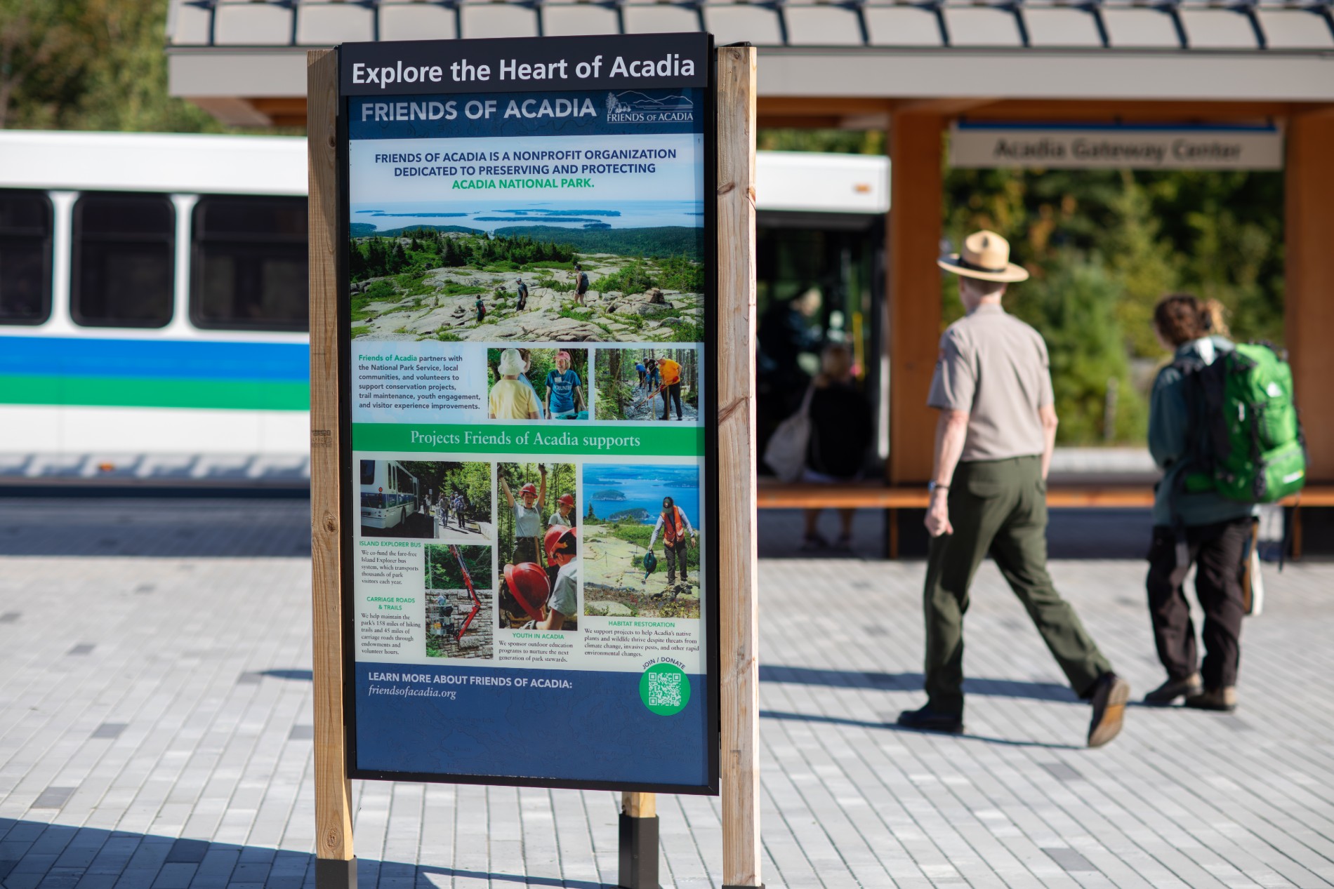Friends of Acadia information poster outside the Acadia Gateway Center on Wednesday, September 3, 2025. (Julia Walker Thomas/Friends of Acadia)