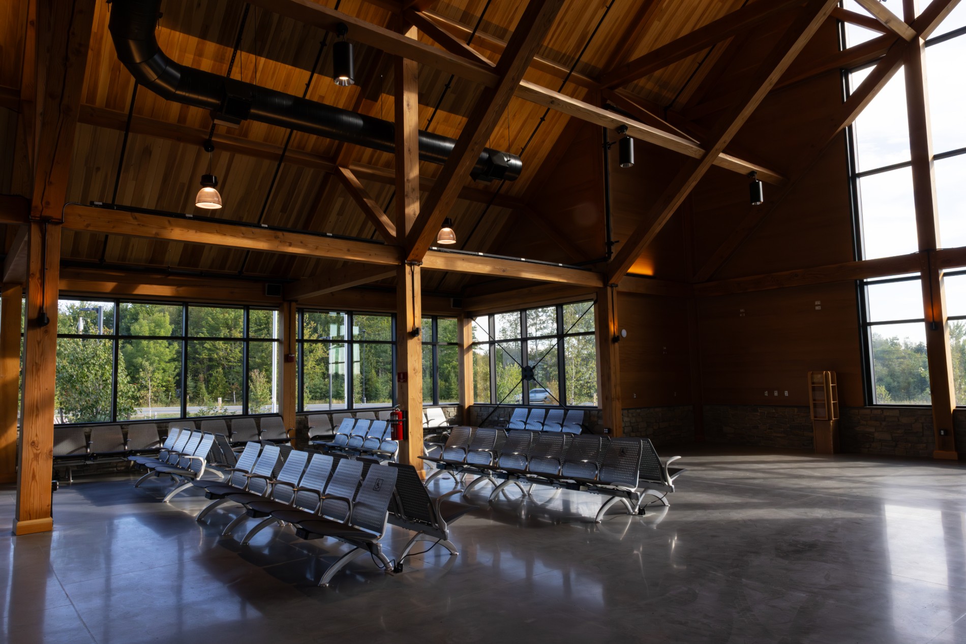 Bus waiting area for Island Explorer riders at the Acadia Gateway Center on its first official day open to the public on Wednesday, September 3, 2025. (Julia W Thomas/Friends of Acadia)