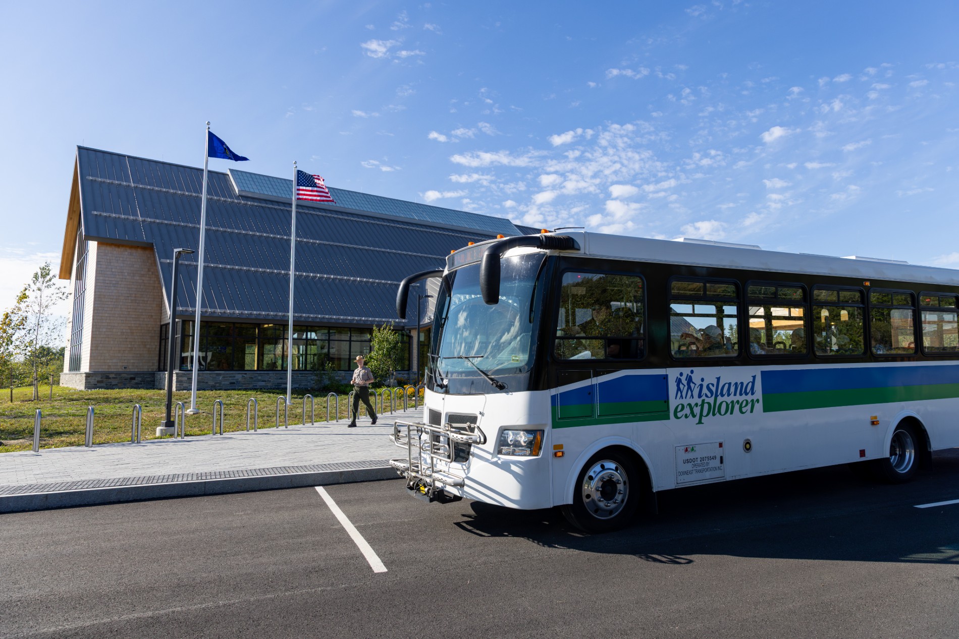 An Island Explorer picks up passengers at the Acadia Gateway Center on its first official day open to the public on Wednesday, September 3, 2025. (Julia Walker Thomas/Friends of Acadia)