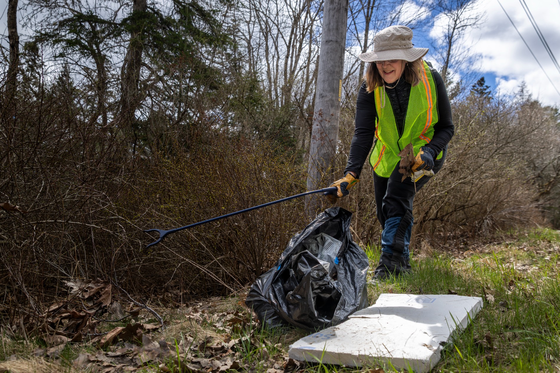 Volunteer Ann Dundon picks up trash during the annual Friends of Acadia Earth Day Roadside Cleanup. (Rhiannon Johnston/Friends of Acadia)