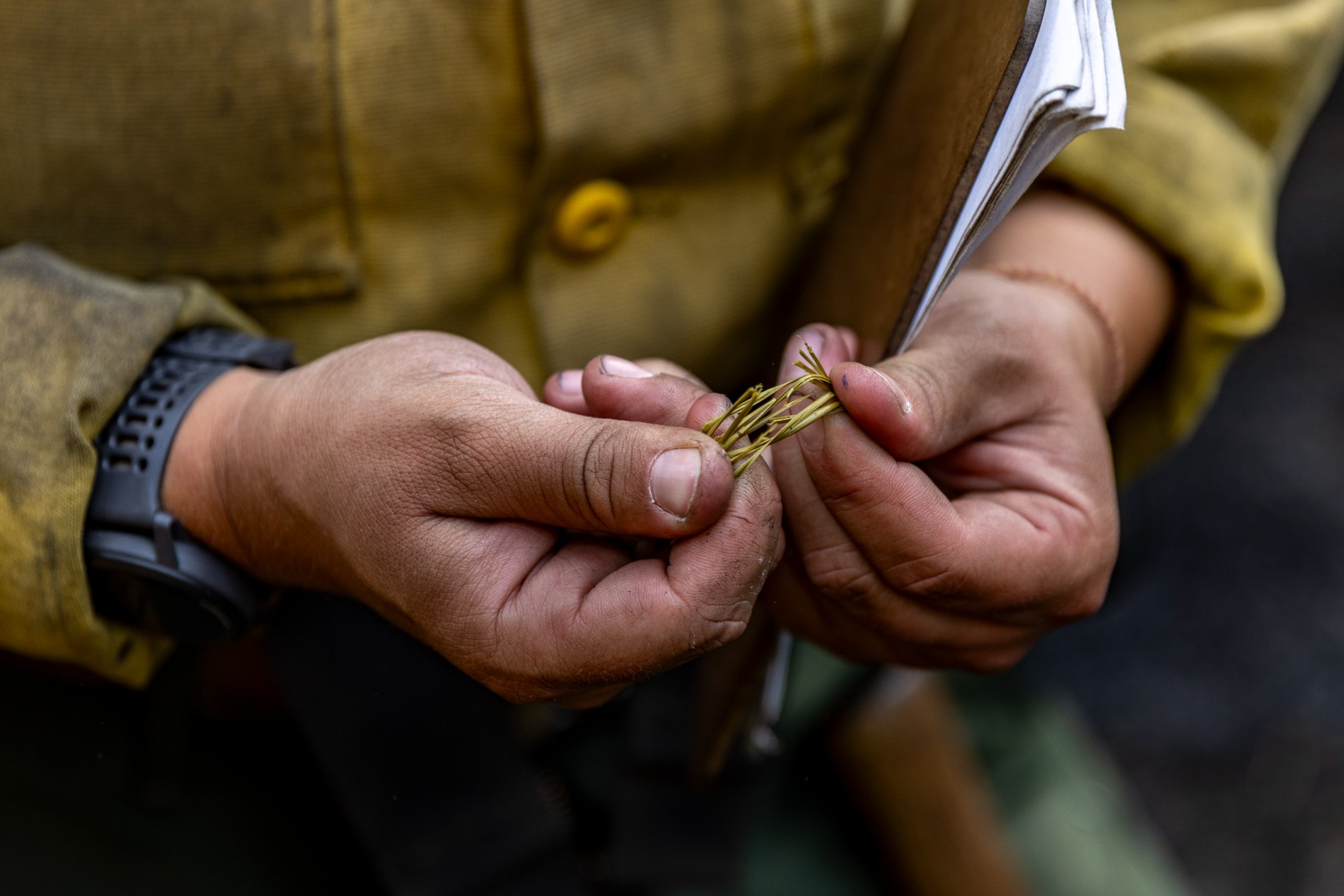 Firefighter A.J. Balduman-Gerrity examines pitch pine needles during a training in Wells, Maine. In fire ecology, the phenomenon where needles