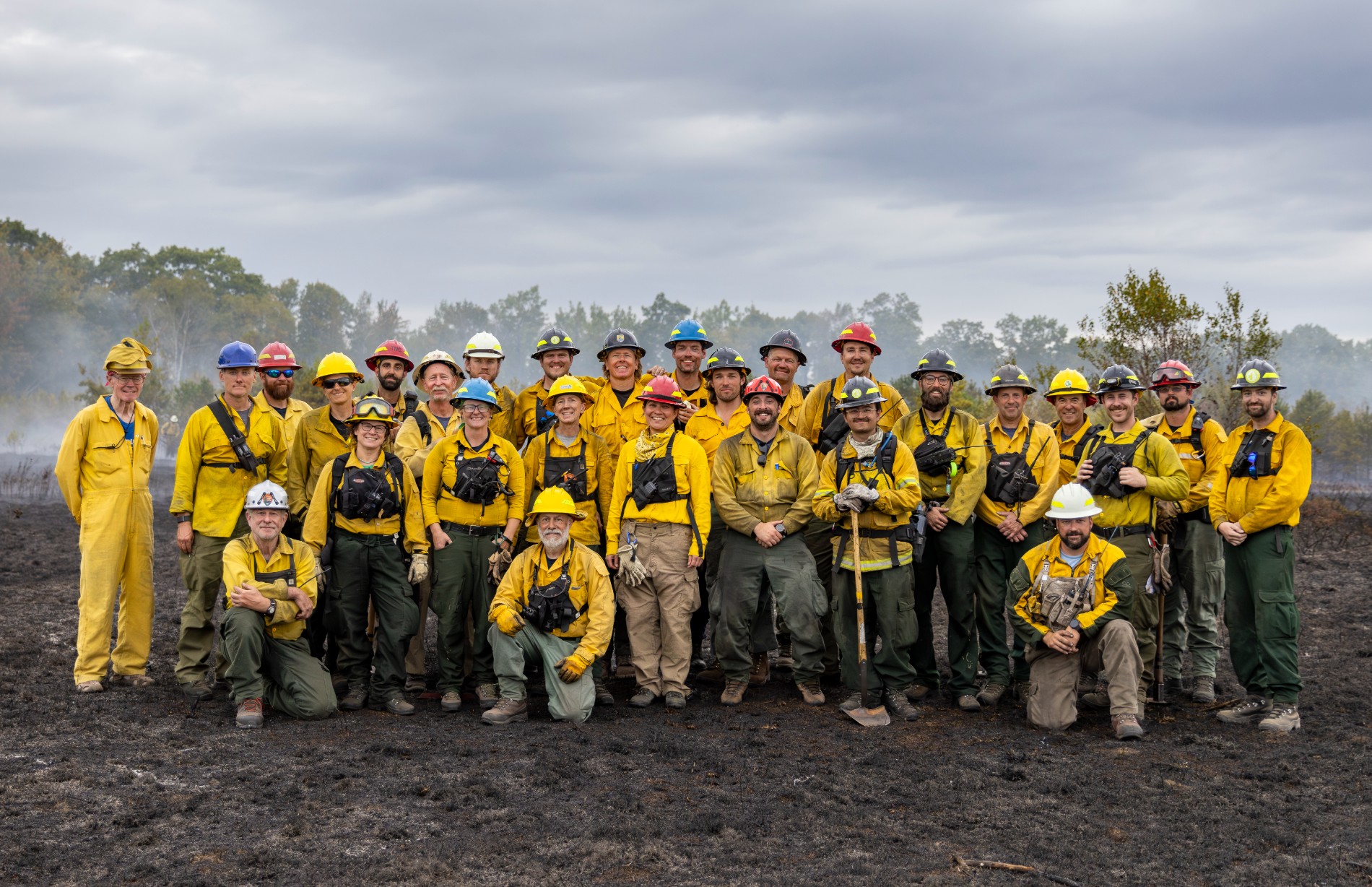 Participants in the 2025 Maine TREX Prescribed Fire Training Exchange pose for a group portrait after completing a prescribed burn on the Wells Barrens Preserve in Wells, Maine. The training included participants from the Acadia National Park Fire Management Team Members as well as more than a dozen states and