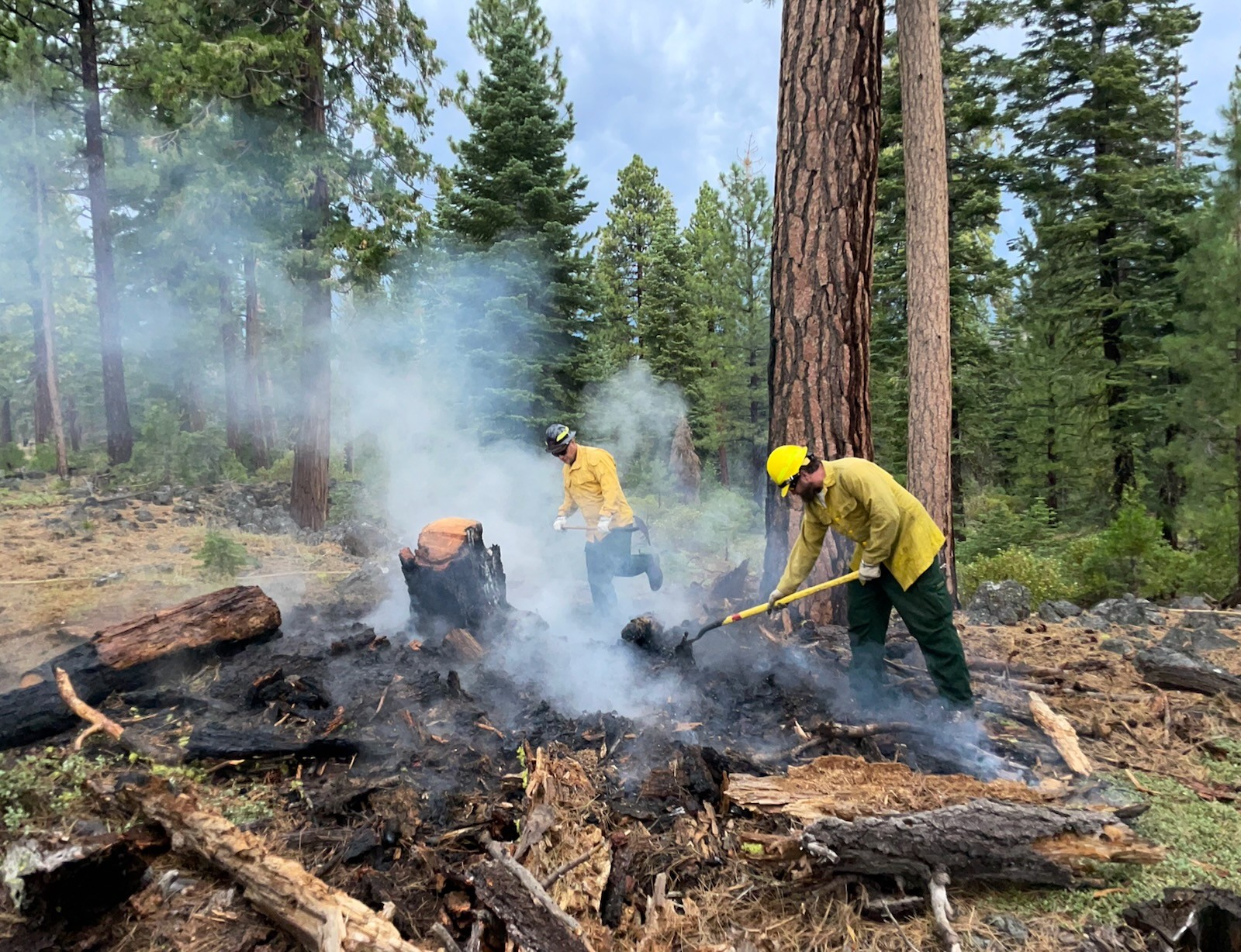 ranger, and Matt Grant (right), part of the Acadia National Park trail crew, provide initial attack efforts to a tree that was struck by lightning in Hat Creek Wilderness in northern California in late July 2025. (Courtesy Marty Huysman)