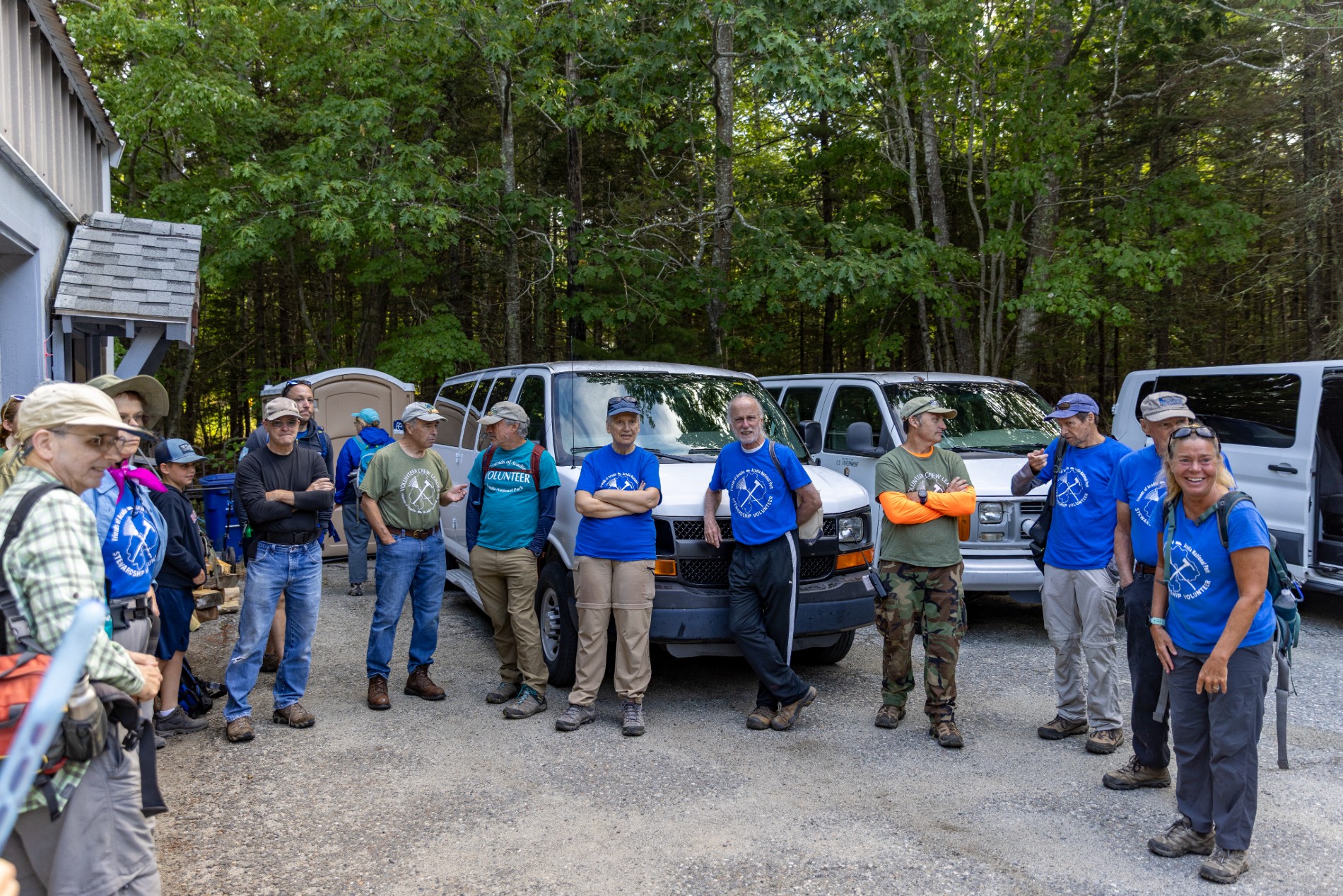 Drop-in Stewardship Volunteers congregate outside of the volunteer shed prior to daily project assignments.(Rhiannon Johnston/Friends of Acadia)