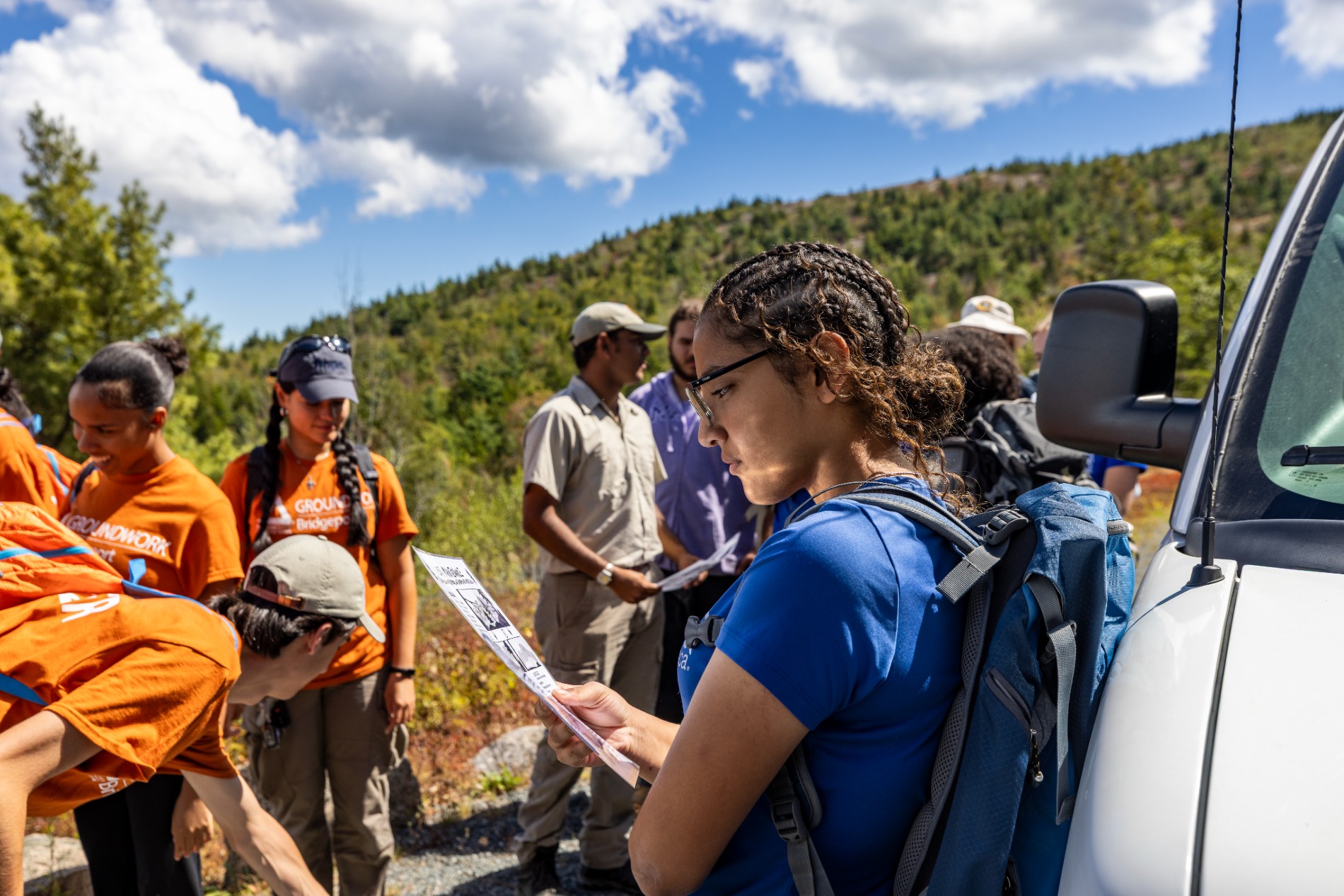 Drop-in Stewardship Volunteers, with Groundwork Bridgeport and SCA Americorps, prepare to clear a vista on the Upper Mountain Carriage road with NPS Trail Crew. (Rhiannon Johnston/Friends of Acadia)