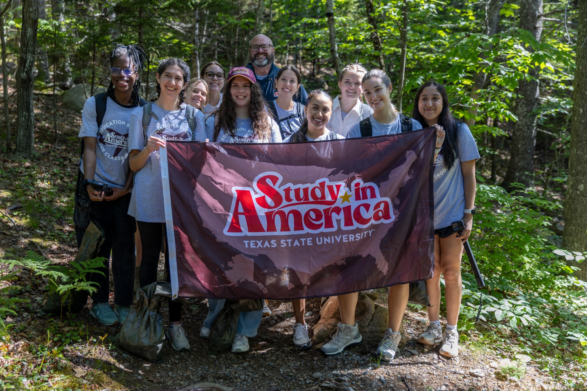 Volunteers from Texas State University prepare to haul soil up to restoration sites at the summit of Sargent mountain. (Rhiannon Johnston/Friends of Acadia)