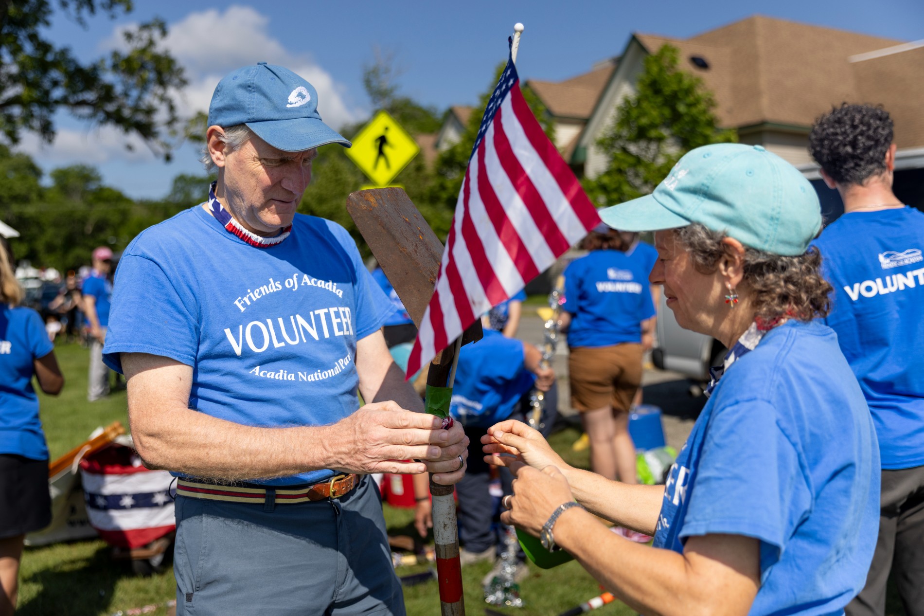 Ruth (right) and other volunteers prepare to walk in the annual Bar Harbor Fourth of July Parade. (Rhiannon Johnston/Friends of Acadia)