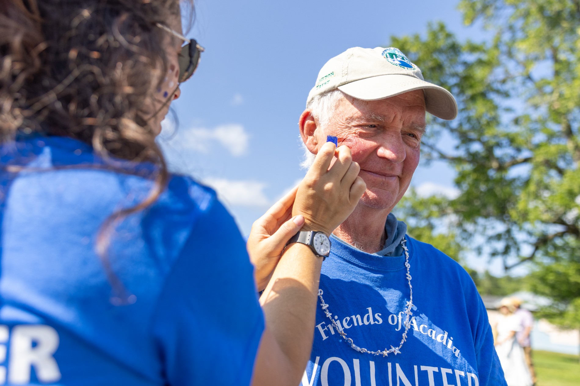 Nikki Burtis applies face paint to Friends of Acadia volunteer John Baird before the annual Bar Harbor Fourth of July Parade. (Rhiannon Johnston/Friends of Acadia)