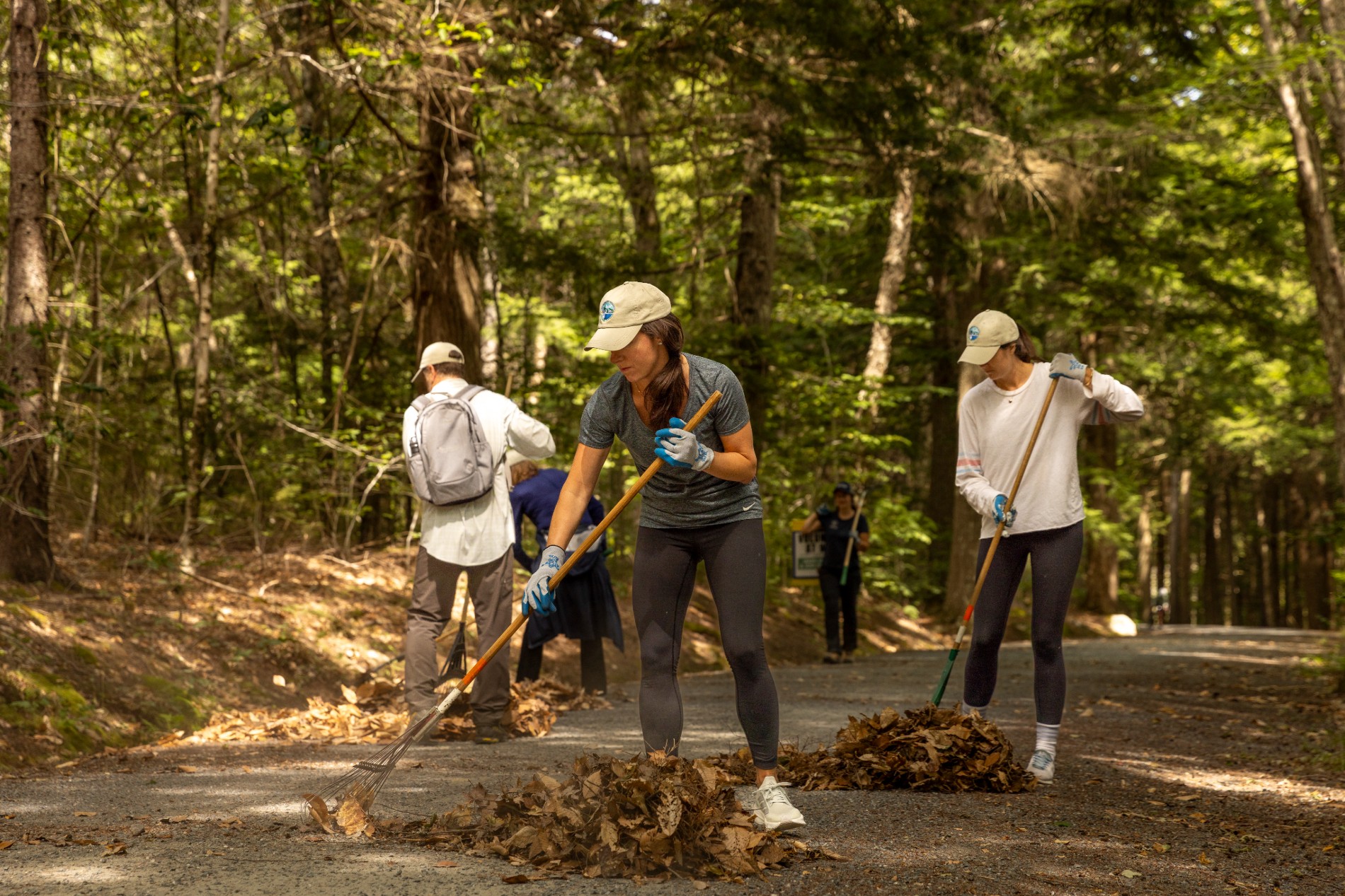 Chilton Trust employees rake leaves from the carriage roads and clear out drainage during a volunteer day in Acadia.(Rhiannon Johnston/Friends of Acadia)