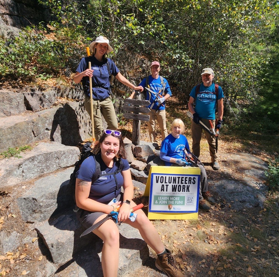 Volunteers with the Stewardship Crew pose during a break while doing work on Acadia’s trails.