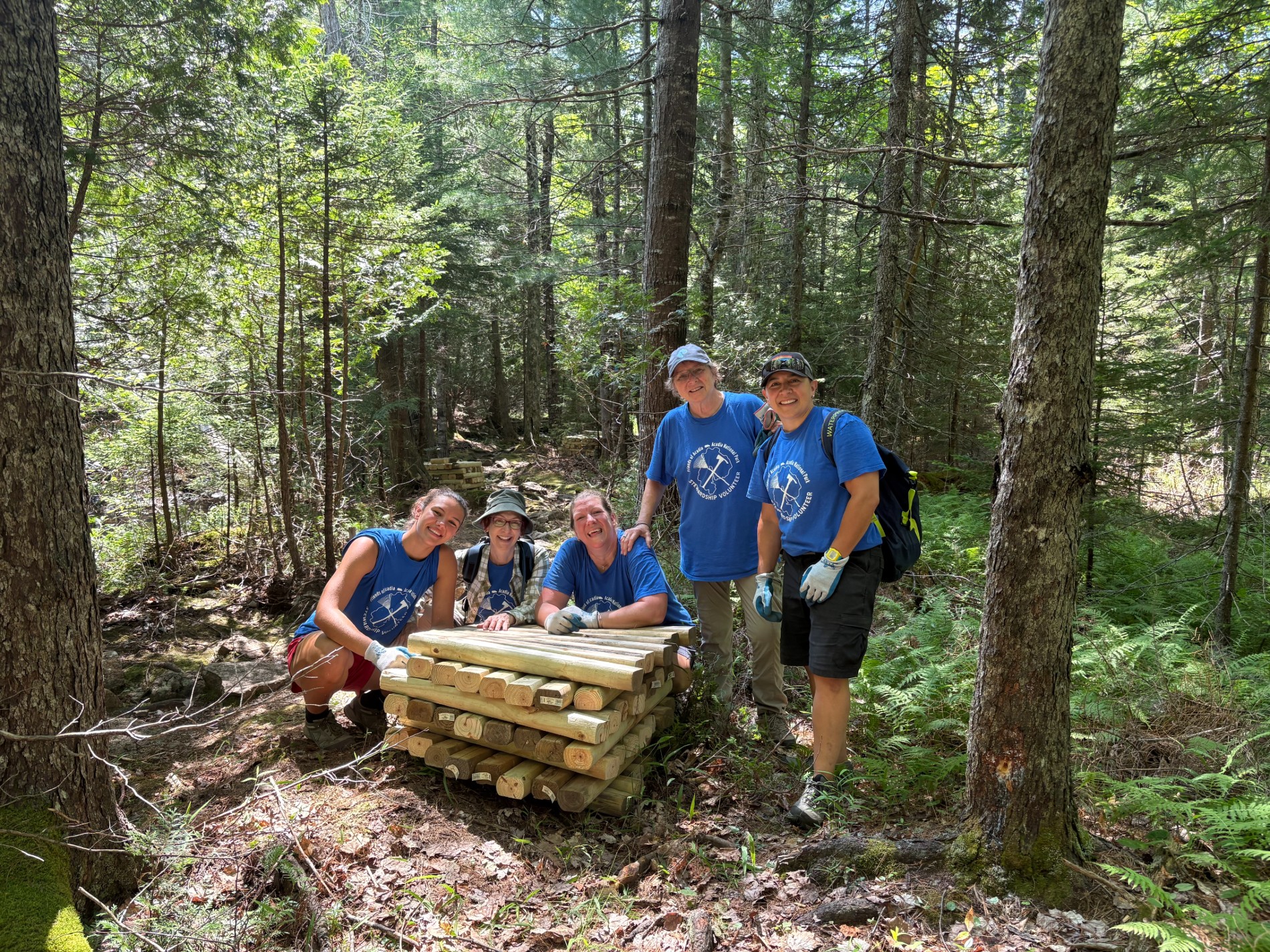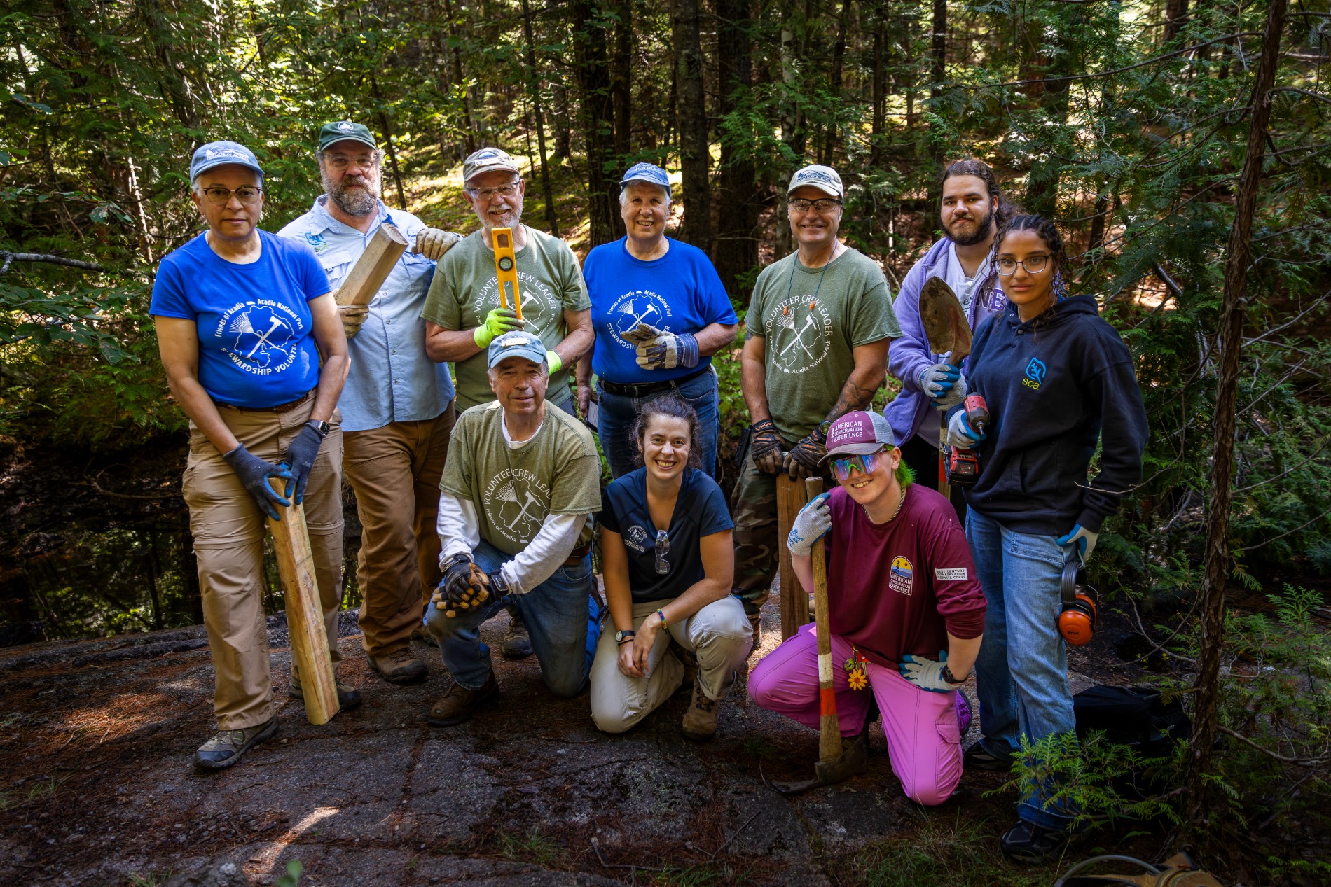 Volunteers with Friends of Acadia’s Drop-in Stewardship Program, pose for a portrait while building new bogwalk, (Rhiannon Johnston/Friends of Acadia)