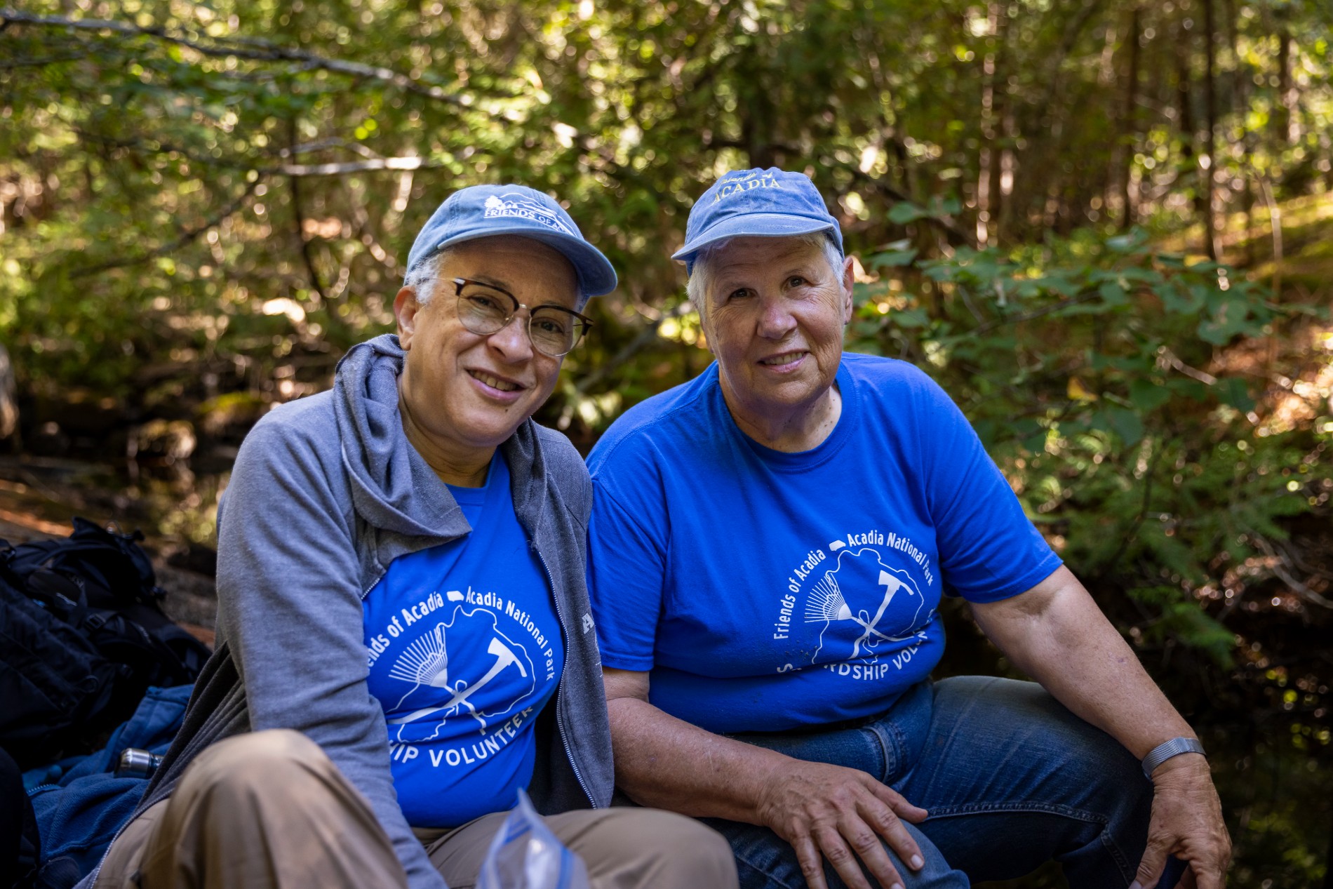 Liane Rozzell (left) and Linda Kaufman, volunteers with Friends of Acadia’s Drop-in Stewardship Program, pose for a portrait while building a new bogwalk on the Hadlock Ponds Trail. (Rhiannon Johnston/Friends of Acadia)