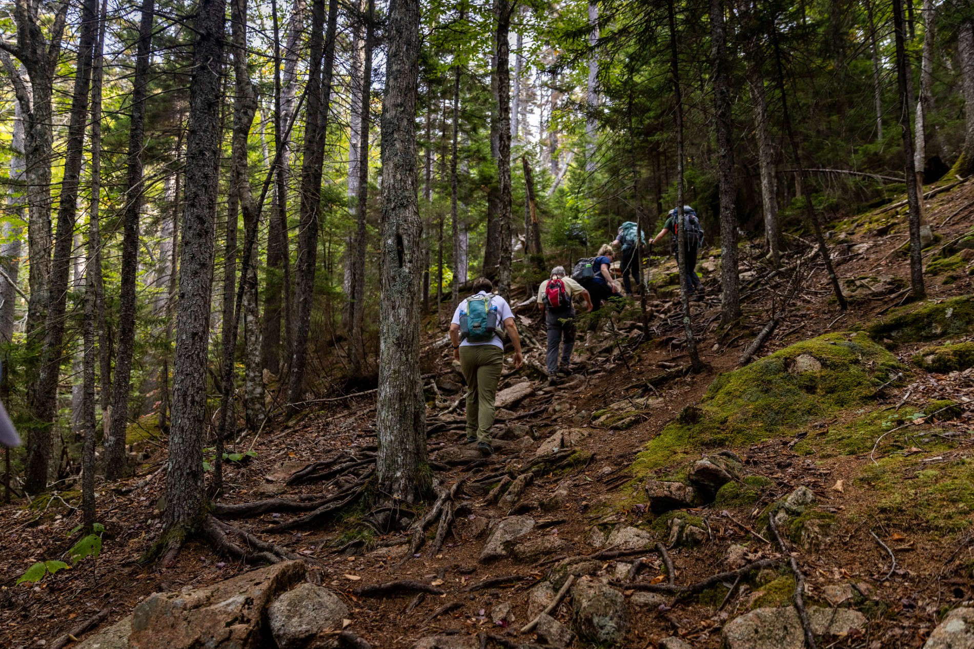 Save Our Summits volunteers hike up Sargent Mountain with backpacks full of soil. (Rhiannon Johnston/Friends of Acadia)