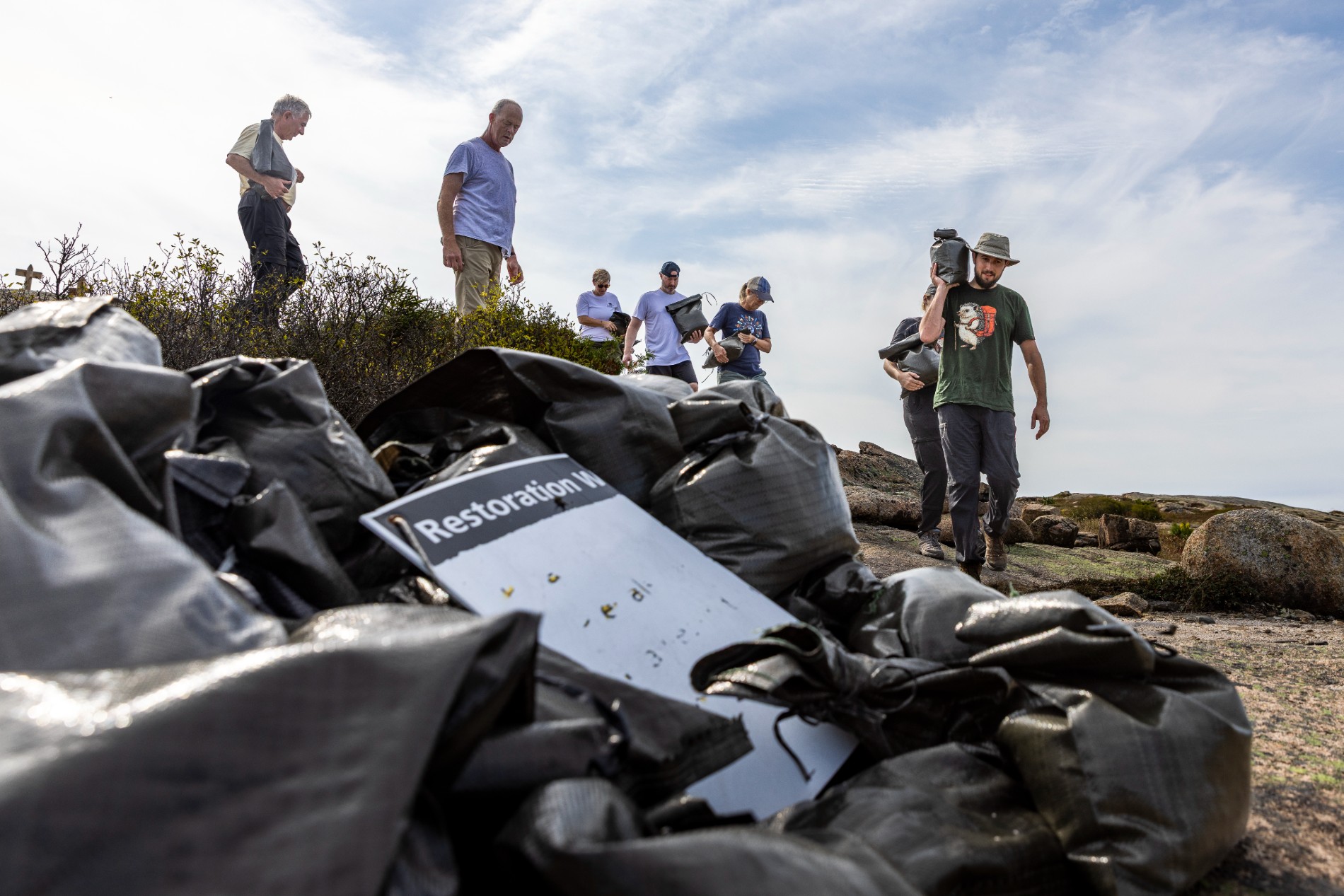 Volunteers pile up their bags of soil at the summit of Sargent Mountain. Participants chose how much soil to carry in their packs, ranging from 5 to 25 pounds, and that soil is used during summit restoration projects. (Rhiannon Johnston/Friends of Acadia)