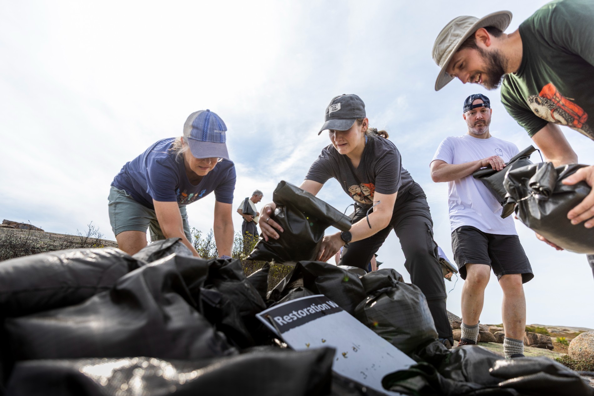 Volunteers ready their bags before hiking with soil to the summit of Sargent Mountain during a Save Our Summits hike. (Rhiannon Johnston/Friends of Acadia)