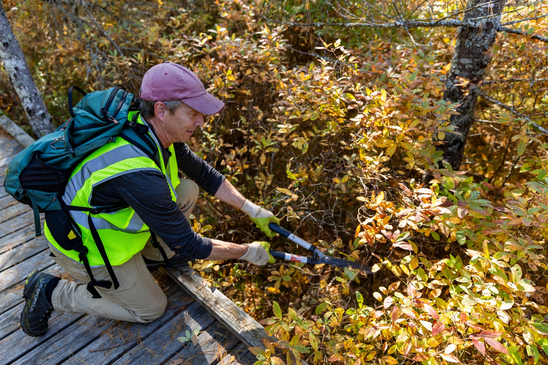 A volunteer with the Volunteer Drop-in Program use a pair of shears to remove branches and clear brush. (Rhiannon Johnston/Friends of Acadia)