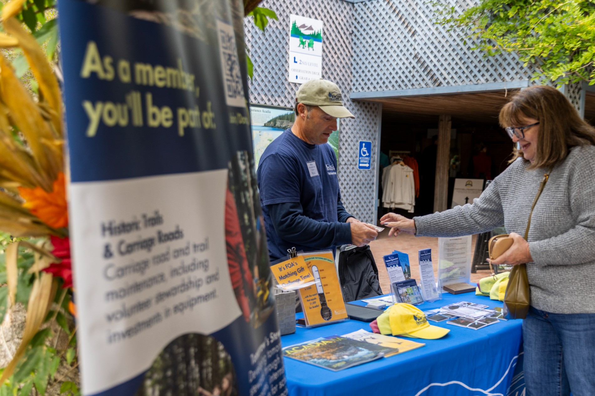Brian Sale, a volunteer with Friends of Acadia, welcomes a new member at the Friends of Acadia Membership Table outside of Jordan Pond House. (Rhiannon Johnston/Friends of Acadia)