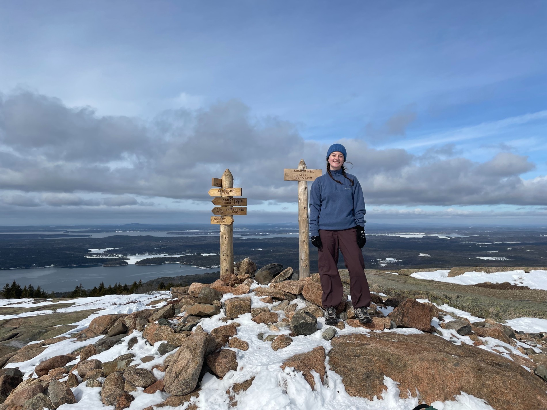Lauren Knierim, community volunteer ambassador at Acadia National Park, stands near the Sargent Mountain summit sign.