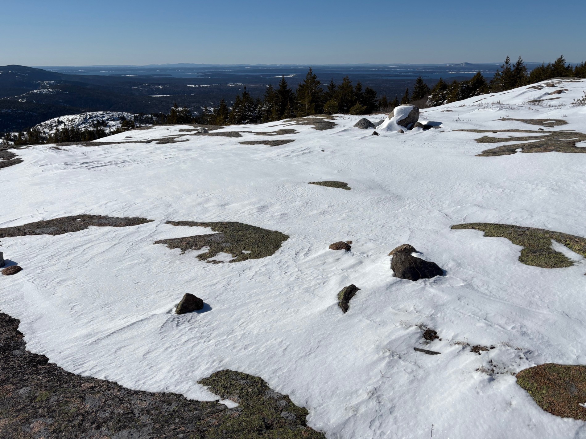 Rocks poke through the snow during a winter trek to the summit of Sargent Mountain to check on vegetation restoration plots. (Lauren Gibson/Friends of Acadia)