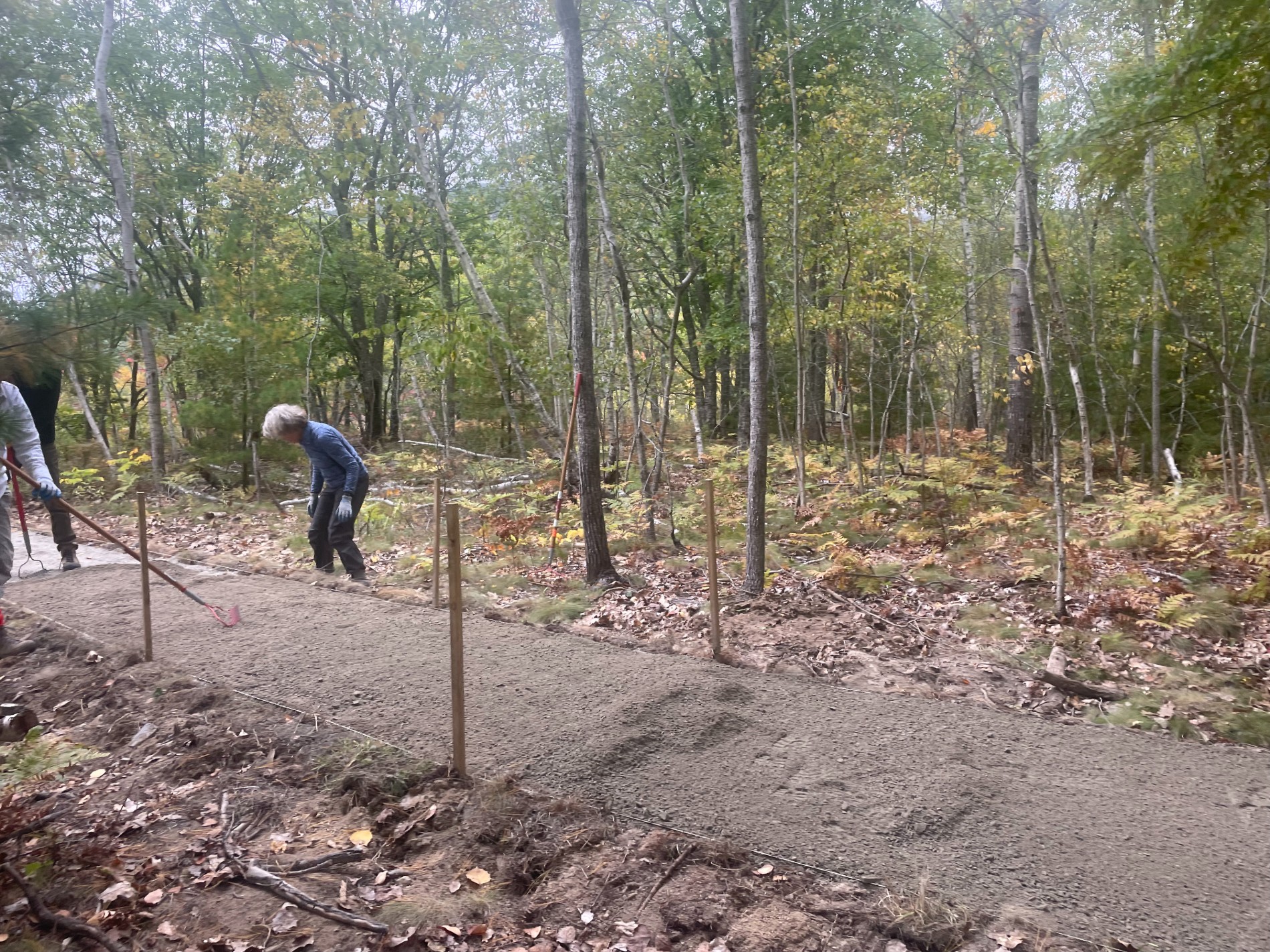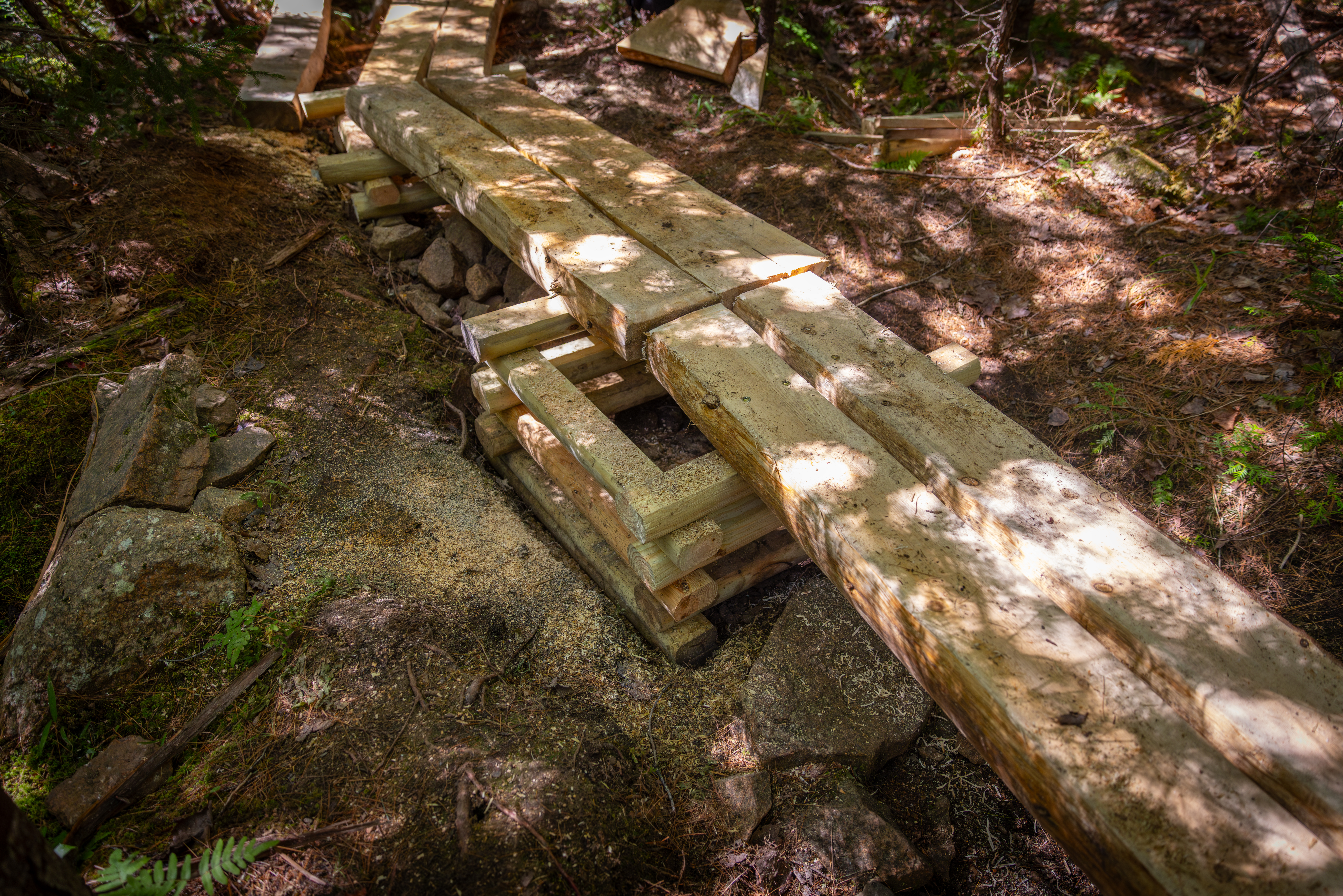 To create a safer, more durable hiking experience, the crew installed new bogwalk on portions of the Hadlock Ponds Trail. This section of the trail is prone to flooding. In the past, this has led to trail widening and social trails as visitors try to avoid puddles and muddy spots. Volunteers helped elevate sections of the trail, helping to keep visitors’ feet dry, prevent slips on roots and uneven surfaces, and protect the fragile vegetation vital to keeping the streambank from eroding. The new bogwalk will help ensure the trail remains safe and sustainable for years to come.