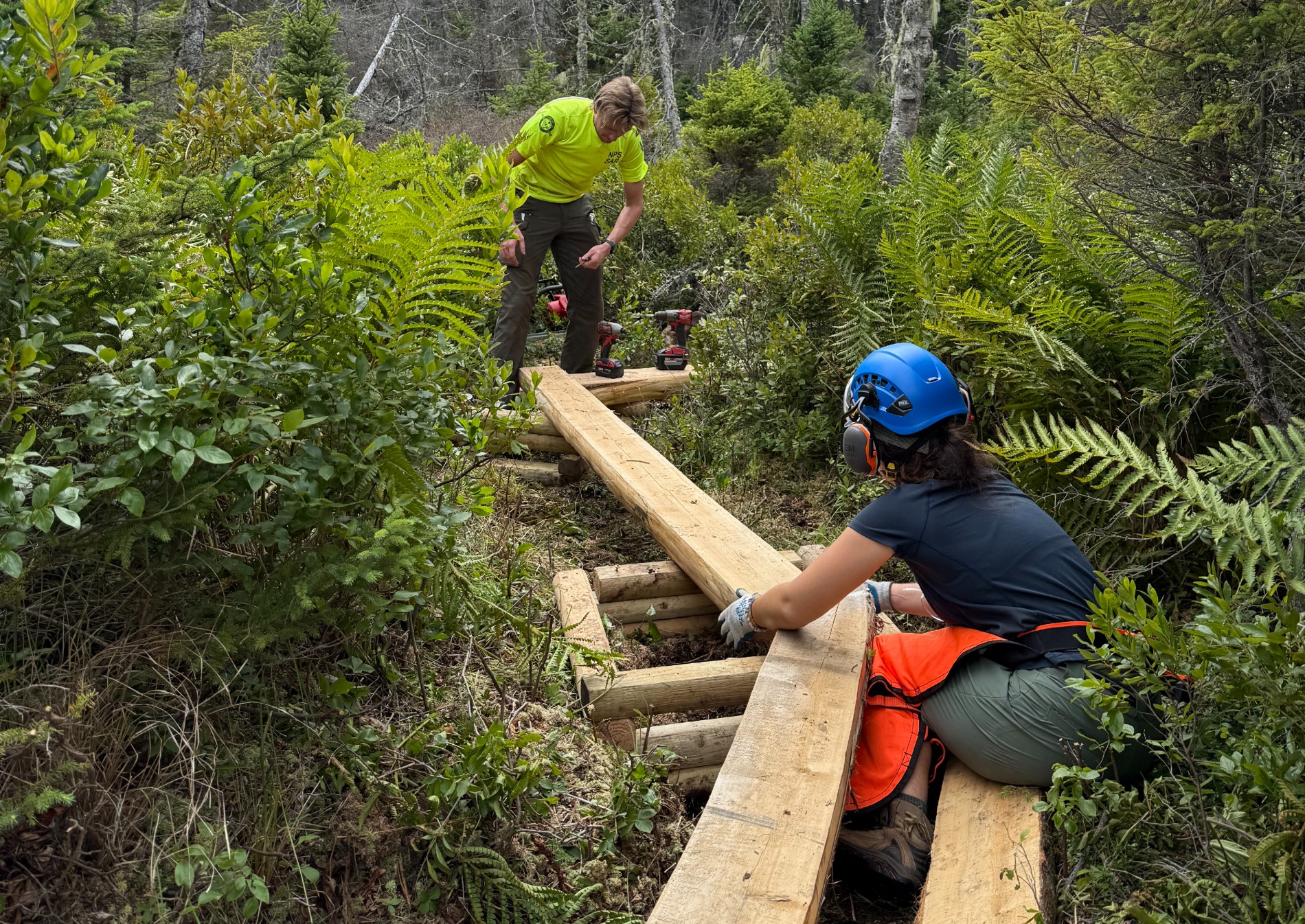 One of the season’s most unique projects involved supporting the park’s Vegetation Crew in protecting rare boreal blueberry plants on Cadillac Mountain. In May, volunteers helped craft and transport “Charlie Rope” stanchions to safeguard restoration areas. In June, they carried soil to restoration plots in the same area near the summit. This project supports the long-term health of a fragile alpine ecosystem found in only a few places in the Northeast.