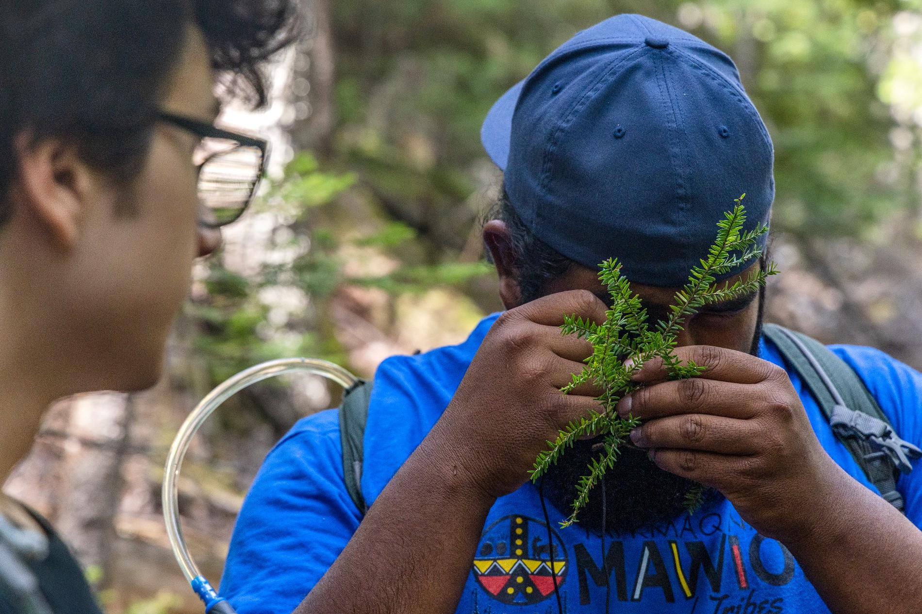 Wambli Martinez (right), of Houlton, ME, working with the vegetation crew via the AL Trail Crew of Wabanaki Youth in Science (WaYS), uses a hand scope to identify hemlock woolly adelgid, an invasive pest threatening hemlock trees. (Photo by Sam Mallon/Friends of Acadia)